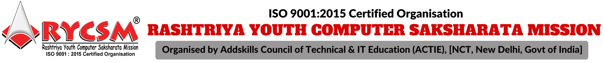 Rashtriya Youth Computer Saksharata Mission is a Trust had been founded under the RYCSM (Rashtriya Youth Computer Saksharata Mission) with the vision of being a reliable Trust, producing at acompetitive level in line with the National Computer Education in India, specially from the rural section.  RYCSM (Rashtriya Youth Computer Saksharata Mission) is a Registered under the Trust Act - 1882 from Govt of India, having as ISO 9001 :2015 Organization as well.